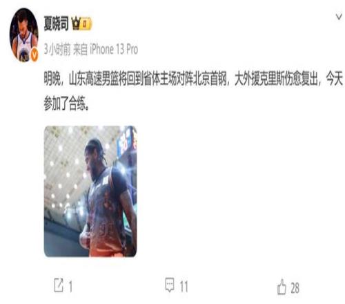 日前,山東男籃終于傳來了一個好消息。媒體人夏曉司透露,山東大外援克里斯傷愈復(fù)出,并且參與了合練。而山東隊下一場比賽將會回到主場省體,對陣北京男籃,如果這場比賽克里斯能夠出戰(zhàn),對于山東止住連敗頹勢,無疑是一個利好消息,不少球迷也熱議道:“快回來救救涼指導(dǎo)吧?!?/p>