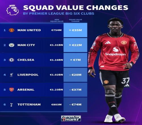 3月9日,德國轉(zhuǎn)會市場網(wǎng)站更新了英超球員身價,并列出了英超BIG6球隊(duì)身價變化,曼聯(lián)上漲3500萬歐最多,而熱刺則暴跌7400萬歐。