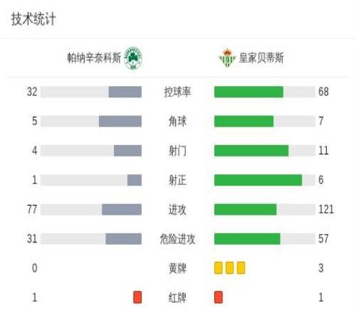 北京時(shí)間3月13日歐足聯(lián)歐洲聯(lián)賽 1/8決賽首回合,帕納辛奈科斯對陣皇家貝蒂斯。下半場扎魯里兩黃一紅被罰離場,希維德爾斯造點(diǎn),塔沃爾達(dá)點(diǎn)射打入制勝球,迭戈-略倫特兩黃一紅被罰離場。最終比分帕納辛奈科斯 1-0 皇家貝蒂斯。