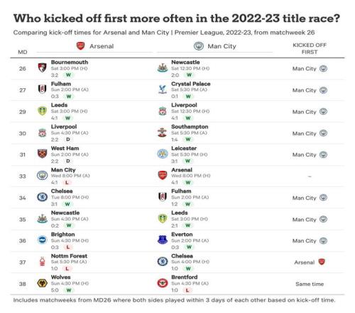 在2022-23賽季的沖刺階段比賽中,曼城在73%的比賽中先賽,他們追上了阿森納8分的領(lǐng)先優(yōu)勢(shì),連續(xù)第三年贏得聯(lián)賽冠軍,也是六個(gè)賽季中的第五次。