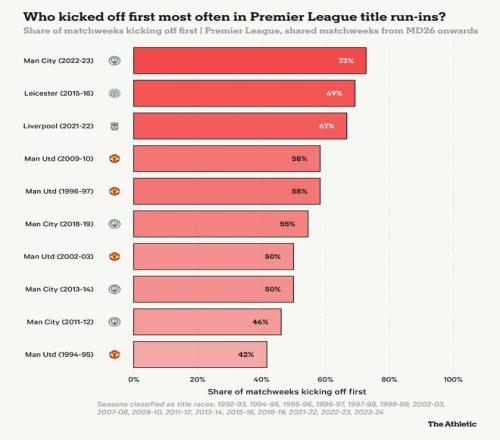 近日,The Athletic發(fā)表專題文章,談到了英超冠軍爭(zhēng)奪戰(zhàn)進(jìn)入最后階段后的賽程爭(zhēng)議,重點(diǎn)探討了潛在冠軍球隊(duì)的開賽順序?qū)Ρ荣惤Y(jié)果的影響,收集了球員、名宿的觀點(diǎn)并結(jié)合過往賽季數(shù)據(jù)進(jìn)行分析,表示先開賽帶來的所謂優(yōu)勢(shì)在數(shù)據(jù)層面并不顯著,真正決定冠軍歸屬的仍是球隊(duì)實(shí)力、戰(zhàn)術(shù)部署與心理素質(zhì),而非賽程安排的細(xì)微差異,以下為專題文章。