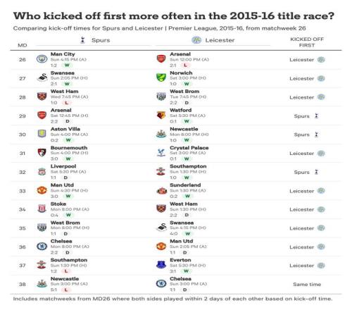 數(shù)據(jù)支持了他們的懷疑。在那個(gè)賽季最后13輪比賽中——就本文而言,這是“冠軍沖刺階段”的界定——萊斯特城有9次先賽,相比之下熱刺只有3次,而最后一輪,像往常一樣,所有10場(chǎng)頂級(jí)聯(lián)賽同時(shí)開球。對(duì)熱刺來說,這包括連續(xù)三場(chǎng)周一比賽,最后一場(chǎng)以一場(chǎng)火藥味十足的2-2客場(chǎng)戰(zhàn)平切爾西告終,這個(gè)結(jié)果將冠軍拱手送給了克勞迪奧-拉涅利、杰米-瓦爾迪和他的隊(duì)友們。