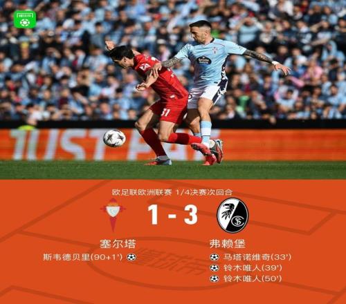 北京時間4月17日歐足聯(lián)歐洲聯(lián)賽 1/4決賽次回合,塞爾塔對陣弗賴堡。上半場馬塔諾維奇首開記錄,隨后鈴木唯人破門擴大比分,下半場鈴木唯人梅開二度,補時階段斯韋德貝里扳回一球。最終比分弗賴堡3-1塞爾塔,兩回合總比分弗賴堡6-1塞爾塔晉級。