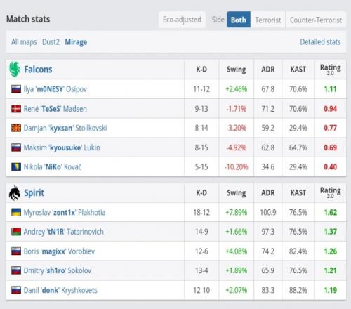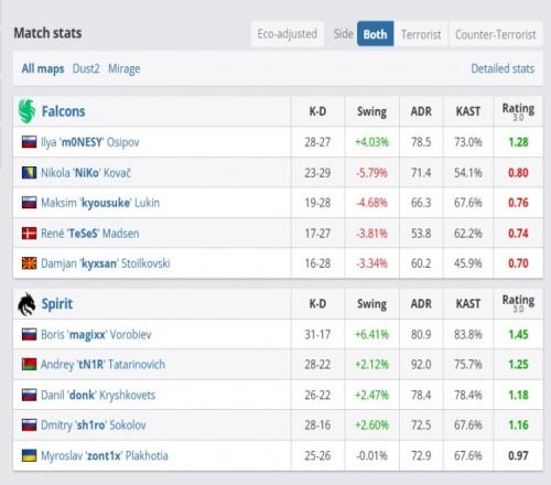 下半場Spirit頂級佯攻戰(zhàn)術贏下手槍局,隨后zont1x拱門三殺聯(lián)手sh1ro拿下2v4殘局沒讓Falcons完成鋼槍翻盤!最終Spirit沒再給機會,以13-4的比分碾壓結束圖二,送Falcons回家!zont1x圖二火力全開貢獻18殺,而NiKo則是經(jīng)典啞火“同意”只有5-15的KD!